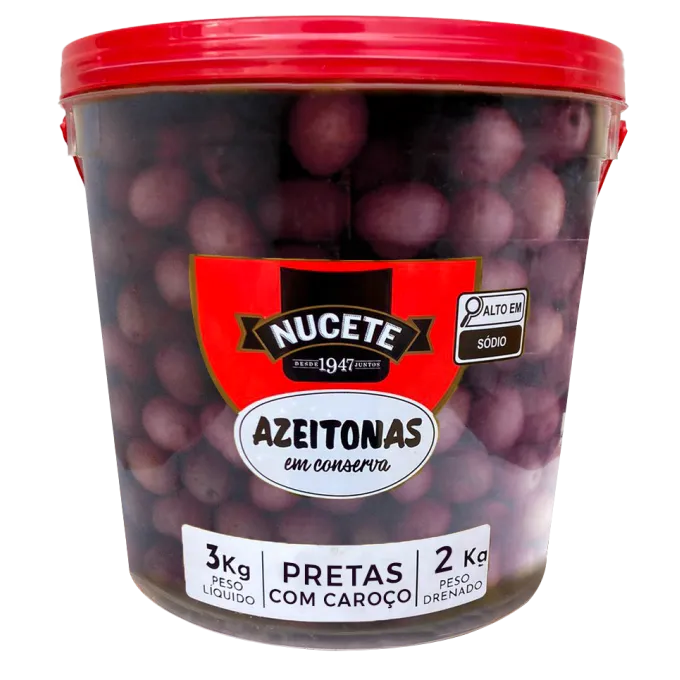 IngredientesAzeitona preta com caroço, salmoura (água e sal), acidulante ácido lático, antioxidantes: ácido cítrico e ácido ascórbico e conservador sorbato de potássio.