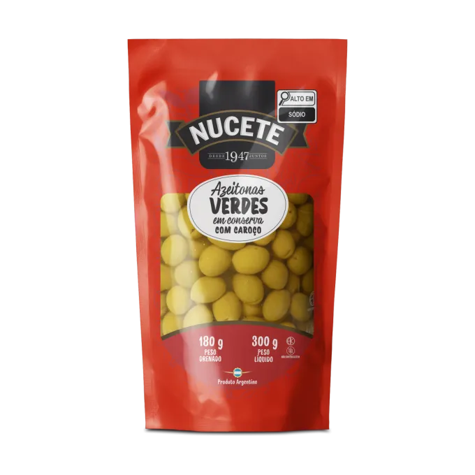 IngredientesAzeitona verdes com caroço, salmoura (água e sal), acidulante ácido lático, antioxidantes: ácido cítrico e ácido isoascórbico e conservador sorbato de potássio.