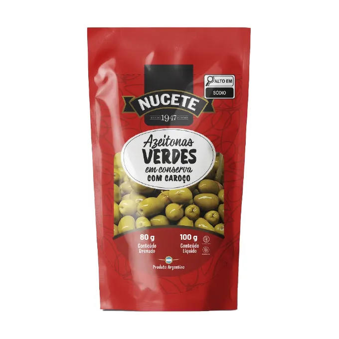 IngredientesAzeitona verdes com caroço, salmoura (água e sal), acidulante ácido lático, antioxidantes: ácido cítrico e ácido isoascórbico e conservador sorbato de potássio.