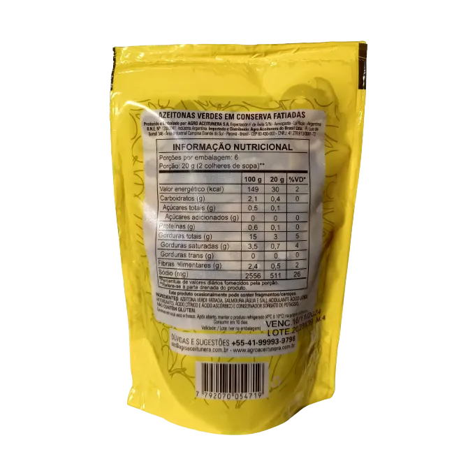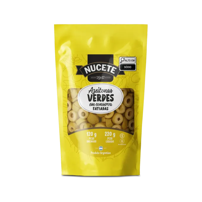 IngredientesAzeitona verde fatiada, salmoura (água e sal), acidulante ácido lático, antioxidantes: ácido cítrico e ácido isoascórbico e conservador sorbato de potássio.