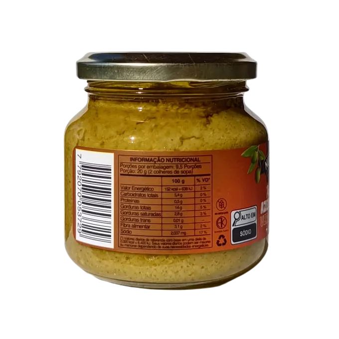DescriçãoO Patê de Azeitonas Verdes com Alho Nucete é uma combinação irresistível de sabores intensos. Feito com azeitonas verdes de alta qualidade e alho fresco embebidos em azeite de olica extra virgem, esse patê possui um sabor marcante e aromático. Sua textura cremosa e consistência suave tornam-no perfeito para ser espalhado em torradas, pães ou utilizado como um molho saboroso para sanduíches e wraps. O Patê de Azeitonas Verdes com Alho Nucete é uma combinação perfeita de sabores, trazendo um toque de frescor das azeitonas verdes e um aroma irresistível do alho. Seja como um aperitivo, um acompanhamento ou um ingrediente para suas receitas, esse patê certamente irá satisfazer os paladares mais exigentes.Dicas de consumoAperitivo: Sirva o patê como um aperitivo antes das refeições. Espalhe-o em torradas crocantes ou pães frescos e acompanhe com queijos, presuntos e azeitonas inteiras para criar uma tábua de petiscos saborosa.